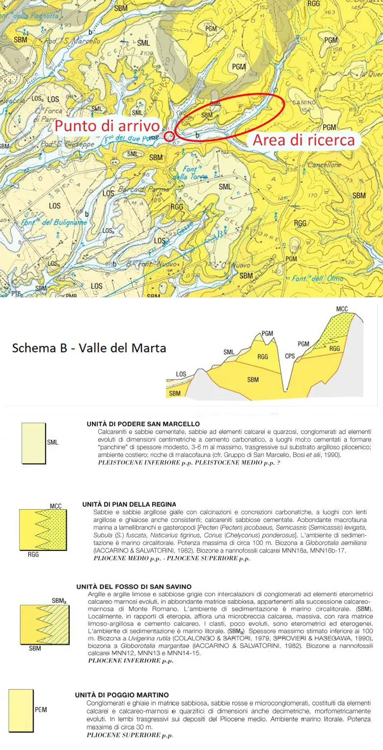 La zona pedecollinare alla quale si giunge è quindi un'area di rideposizione, dove l'erosione causata dagli agenti atmosferici favorisce l'accumulo dei sedimenti dilavati dalle porzioni superiori delle colline: per questo motivo i frequenti fossili rinvenibili a valle sono perlopiù rimescolati tra loro e risultano poco compatibili dal punto di vista di ambiente deposizionale. Nella parte superficiale del terreno si trovano molti frammenti di fossili di carattere litorale-costiero, a volte fortemente erosi, frammisti a clasti eterogenei, arrotondati ma anche spigolosi, costituiti da calcareniti e da Flysch tolfetano (FYT).