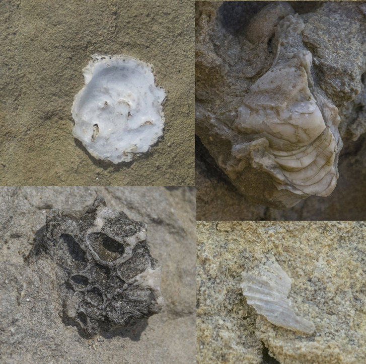Scarrellata di frammenti fossiliferi rinvenuti nelle arenarie di Sant'Agostino. Da sinistra verso destra: una valva di Ostrea, una colonia di Balanus, un frammento di pettinide, una porzione di cerniera di una grossa Ostrea.