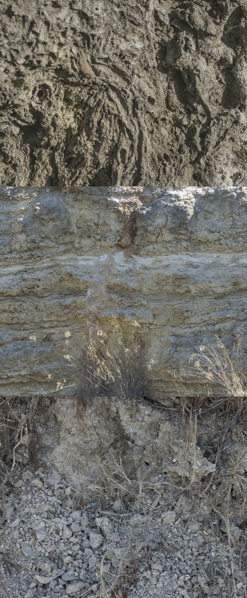 Sopra, alcune rocce sedimentarie fossilifere della Tuscia, da sinistra a destra: argille e silt incoerenti della Macchia della Turchina, calcareniti e sabbie di Località Pisciarello, travertini e calcareous tufa della valle del fiume Marta.Le rocce fossilifere della Tuscia